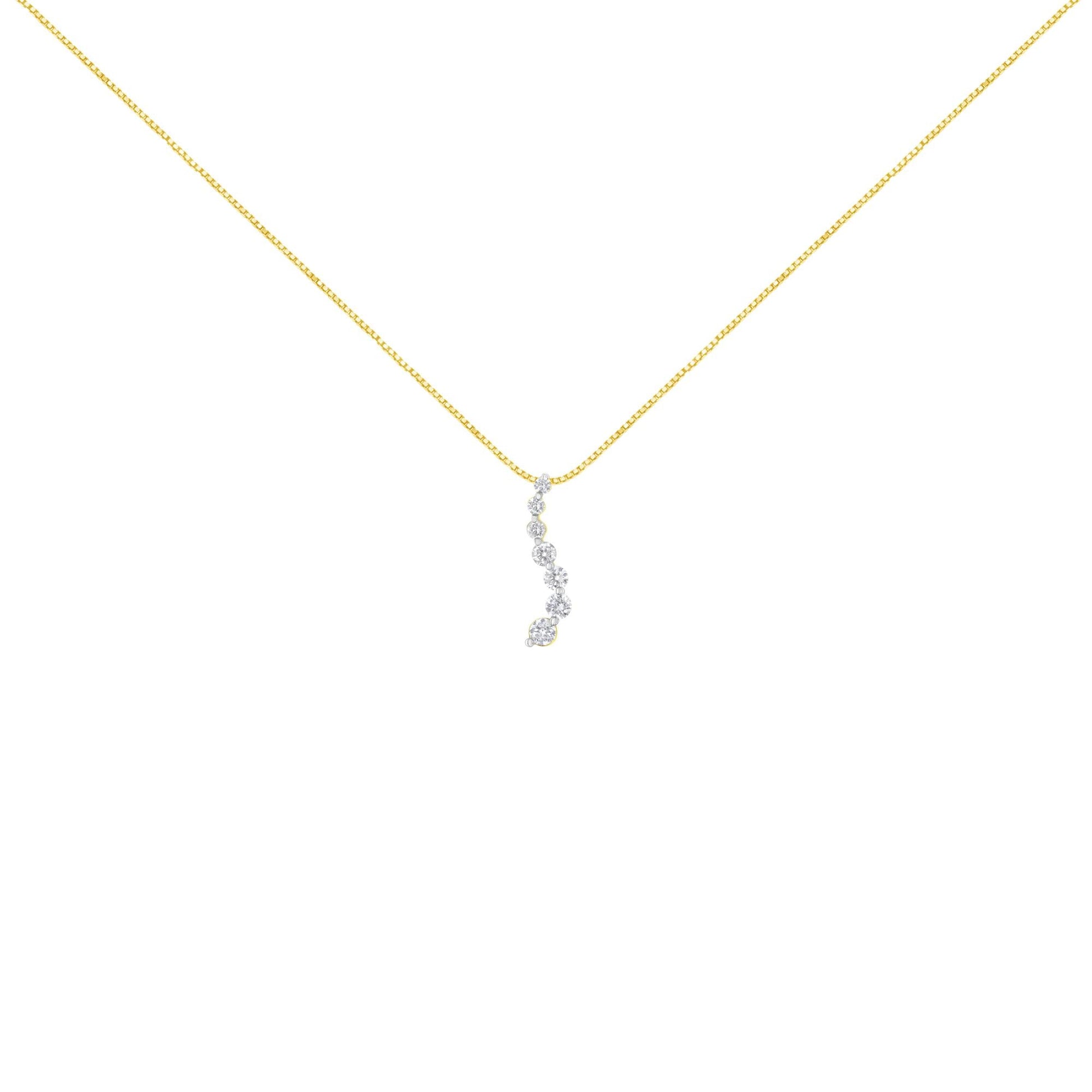 Surprise her by gifting her this beautiful 2.00 cttw diamond journey pendant on any special occasion. Featuring a classy design, the pendant is crafted of warm 14k yellow gold. It is elegantly adorned with sparkling 7 graduating, prong-set round cut diamonds. The pendant is flanked with 40 sparkling baguette diamonds on the side for an extra sparkle. There is no better way to symbolize your growing love as you journey together. This piece comes with an AGS certificate.