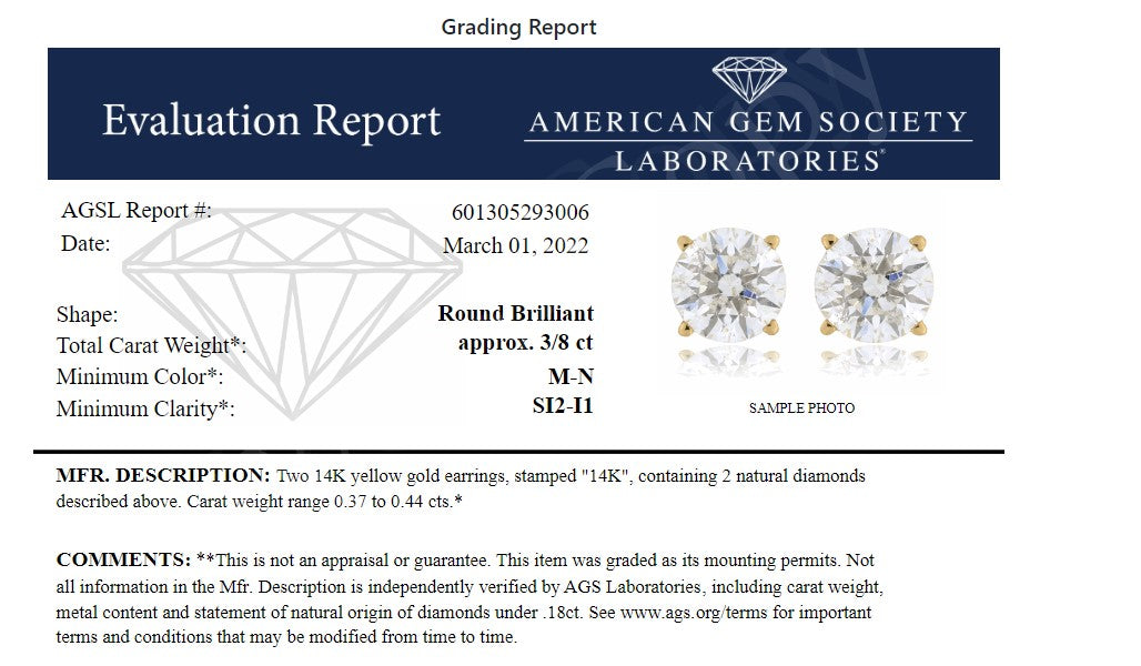 Celebrate any occasion with these classic shimmering diamond stud earrings. Crafted from 14k Yellow Gold each earring showcases a sparkling Brilliant Round-Cut Solitaire Diamond in a 4-Prong Setting. Dazzling with 3/8 cttw of diamonds and a bright polished shine, these Push Back stud earrings secure comfortably on your ear. These diamond studs are certified by the AGS as natural, earth mined diamonds. These diamonds are color rated as M-N Color, and clarity graded as SI2-I1 Clarity . Make these classic diamond studs yours today. Comes as a pair. Each earring piece has a 1/5 cttw diamond and the total weight for this diamond stud pair is 3/8 cttw.