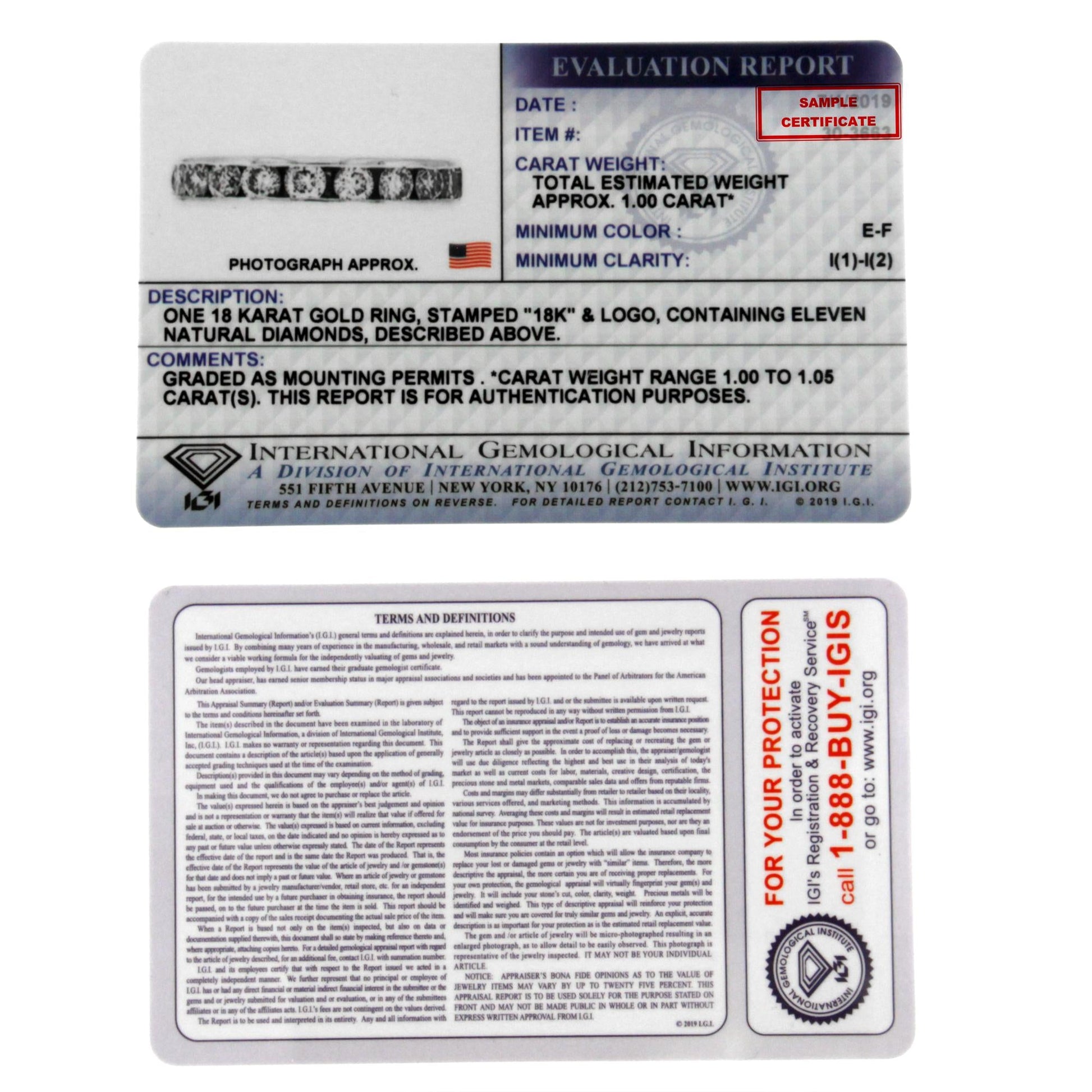 This diamond semi-eternity band features a row of brilliant cut round diamonds channel set in an 18 karat white gold band. There are 11 natural, round-cut diamonds for a total weight of 1 carat. Each band comes with a certificate from IGI for added value and peace of mind. This is a timeless design, guaranteed never to go out of style.