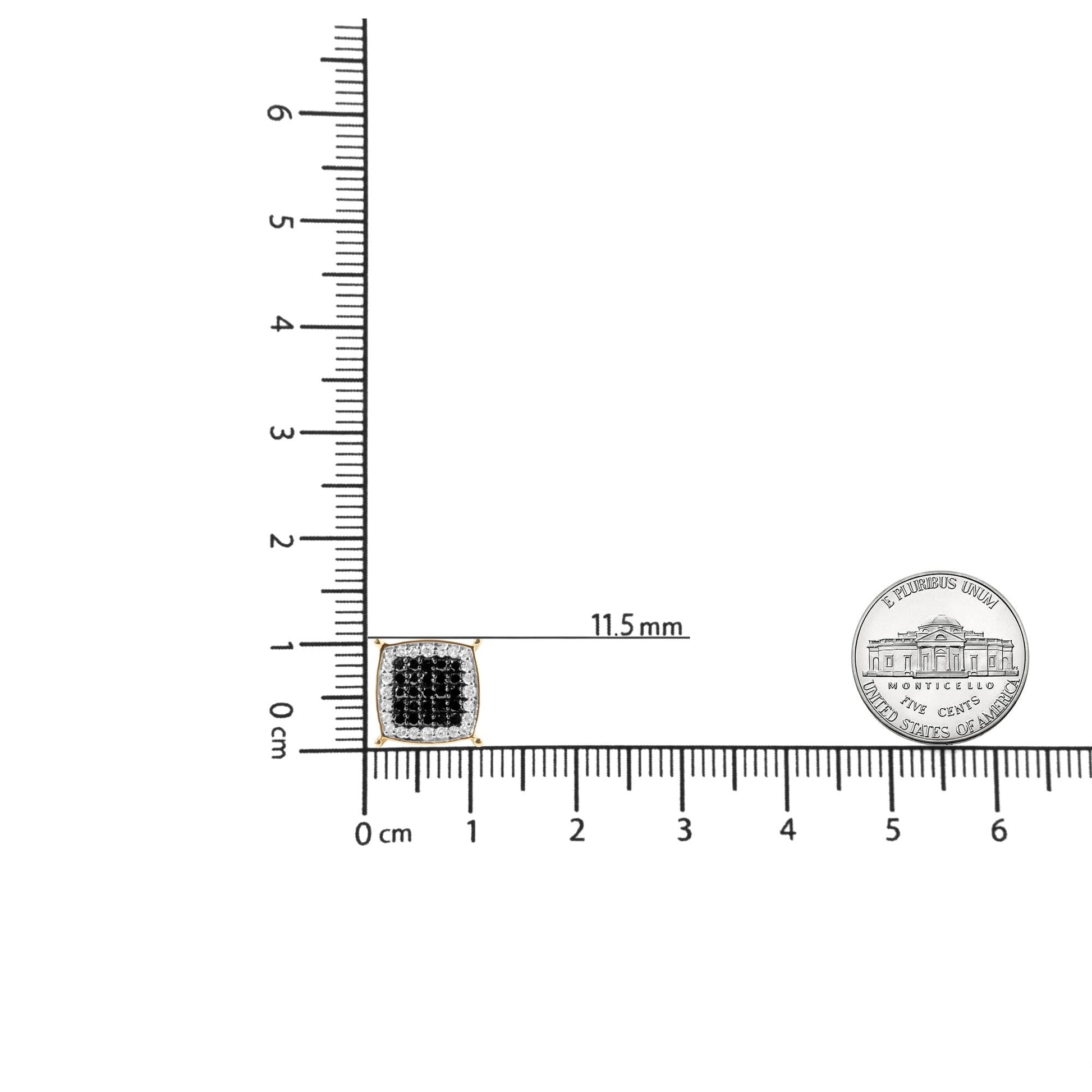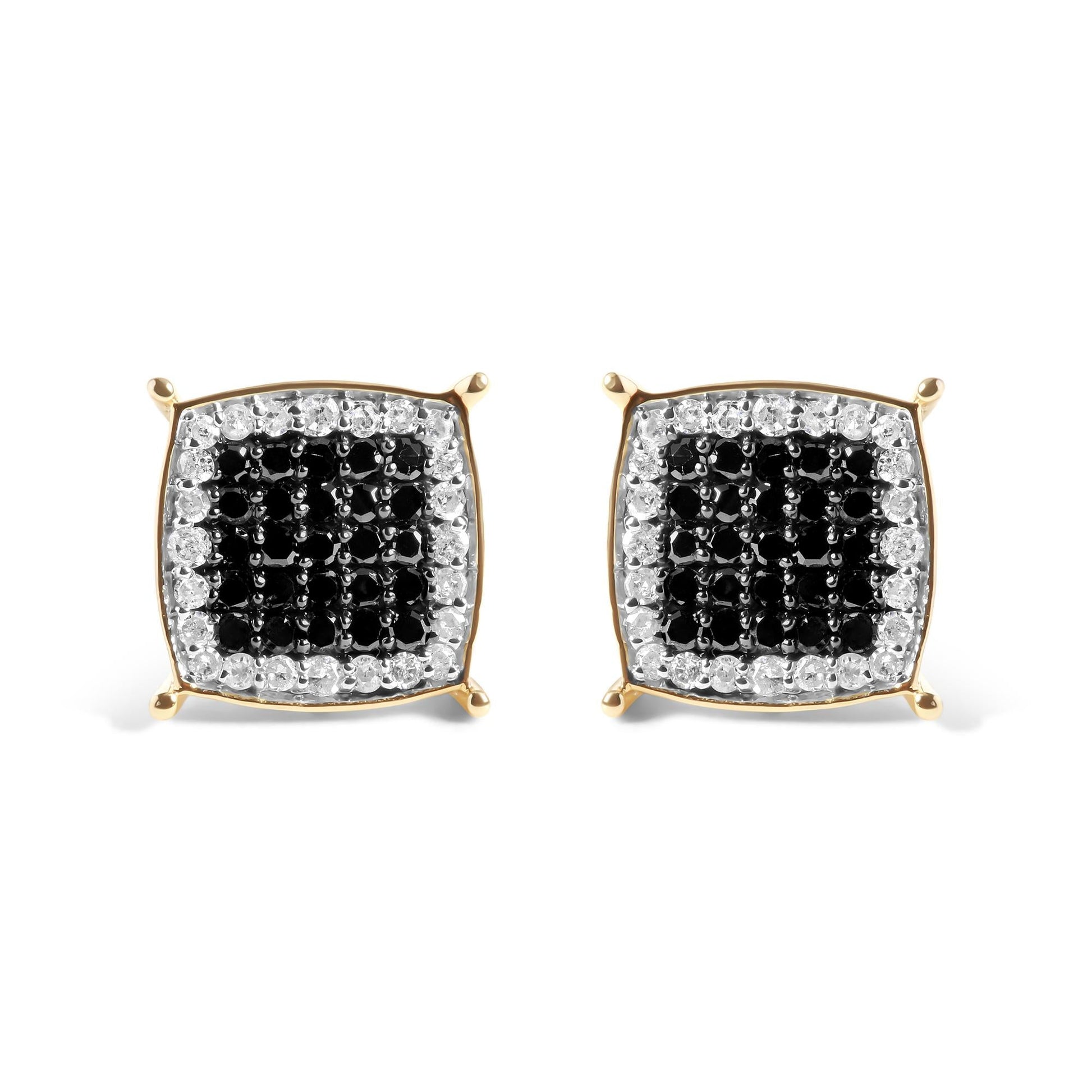 Introduce sophistication and elegance to your everyday style with these stunning men's earrings. Crafted from 10K yellow gold, these earrings feature a captivating combination of black and white treated diamonds that will leave you mesmerized. With a total of 98 diamonds, these earrings boast 50 black color treated diamonds and 48 white diamonds for a total weight of 1/2 carat. The diamonds are of I-J color and I2-I3 clarity, and are set in a prong setting for maximum sparkle. The earring finding is a screw on for a secure fit. These earrings are perfect for any occasion and make for a great gift for any man in your life. Add a touch of luxury to your everyday look with these mesmerizing black and white diamond stud earrings.