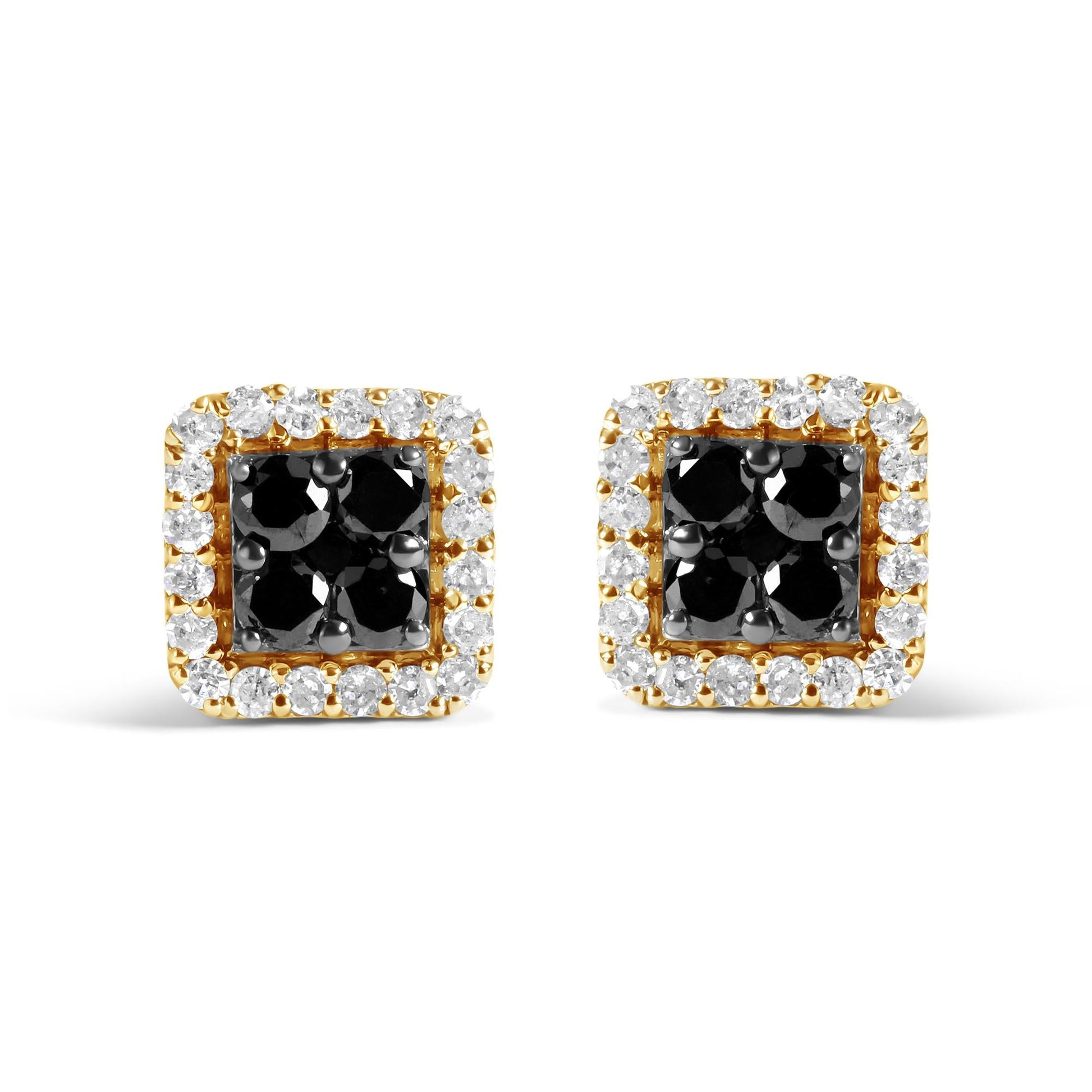 Elevate your style with these stunning composite halo stud earrings, crafted from 10K yellow gold. The sophisticated design features a mesmerizing mix of 50 natural round diamonds, including 10 black diamonds treated for color and 40 white diamonds of I-J color, set in a prong setting. The diamonds are carefully selected for their exceptional I2-I3 clarity, making them a stunning addition to any jewelry collection. With a total diamond weight of 5/8 carats, these earrings are sure to make a statement. The screw-on finding provides a secure and comfortable fit for all-day wear. These earrings are designed with men in mind, making them the perfect gift for a special occasion or just as a treat for yourself.