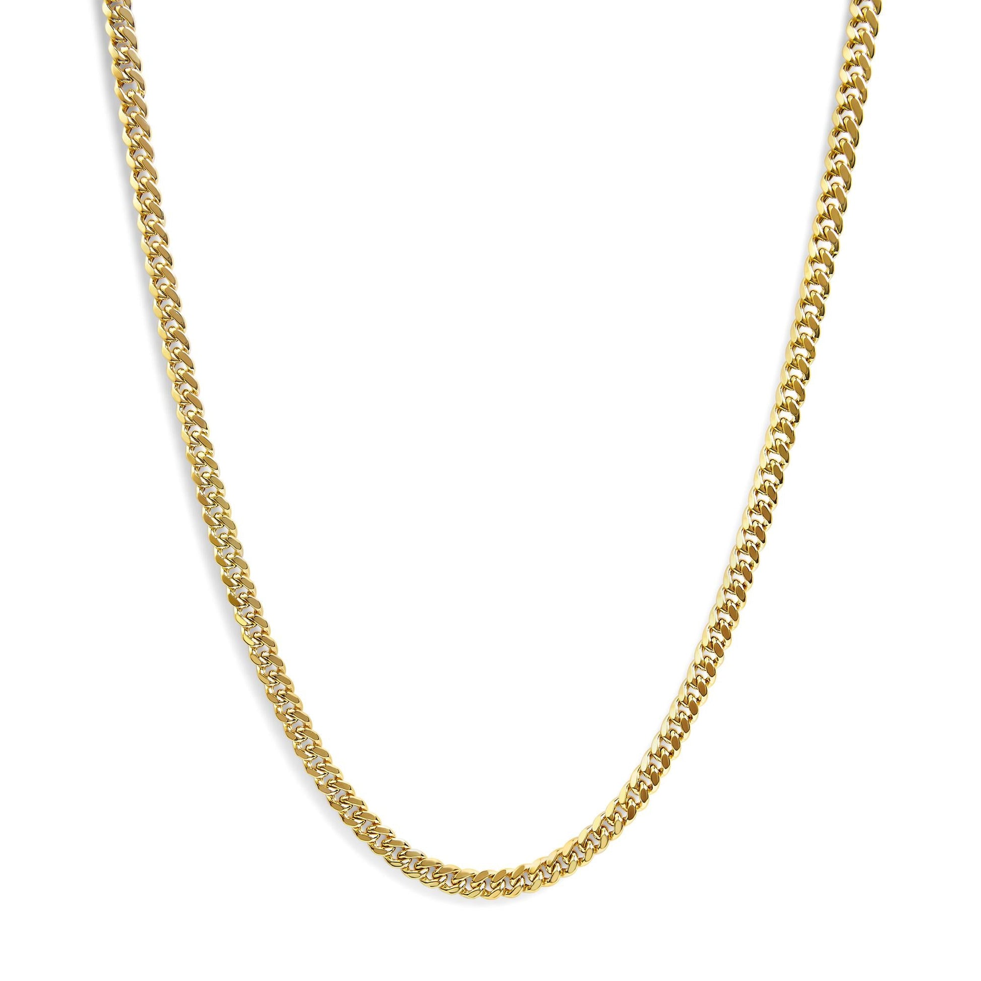 Indulge in the timeless elegance of the semi-solid 14K yellow gold necklace, meticulously crafted in a classic Miami Cuban chain design. At a substantial 6.1mm gauge, this 22-inch masterpiece melds durability with a sumptuous touch, embodying both status and style. The interlocking links, characterized by their flat surface, parade a dazzling degree of shine that captures the eye with every turn. Secured with a robust box clasp, it promises a secure fit for both the sartorially sophisticated man and the woman who dares to defy conventions. Whether draped over a crisp dress shirt or accompanying evening wear, this chain is a testament to a refined aesthetic and an investment in enduring luxury.