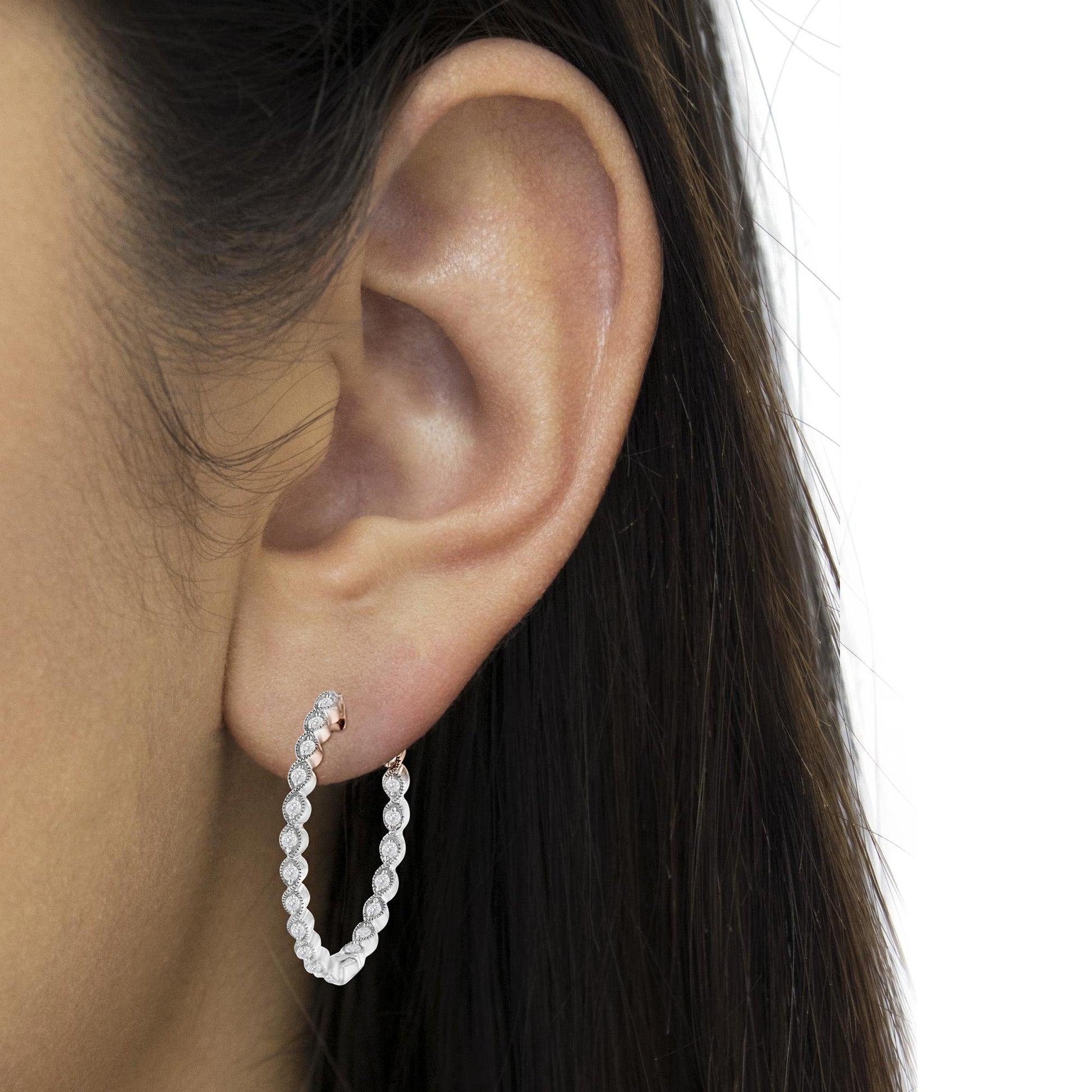 Stylish hoop earring with a round adorable design and a silver-plated color. Made with .925 sterling silver, these earrings include 44 genuine diamonds in a round cut-shape and a prong setting. They present a 3/4ct total diamond weight and come with lever-backs from increased comfort. This versatile and all-purpose everyday use item can be suitable for formal and casual occasions.