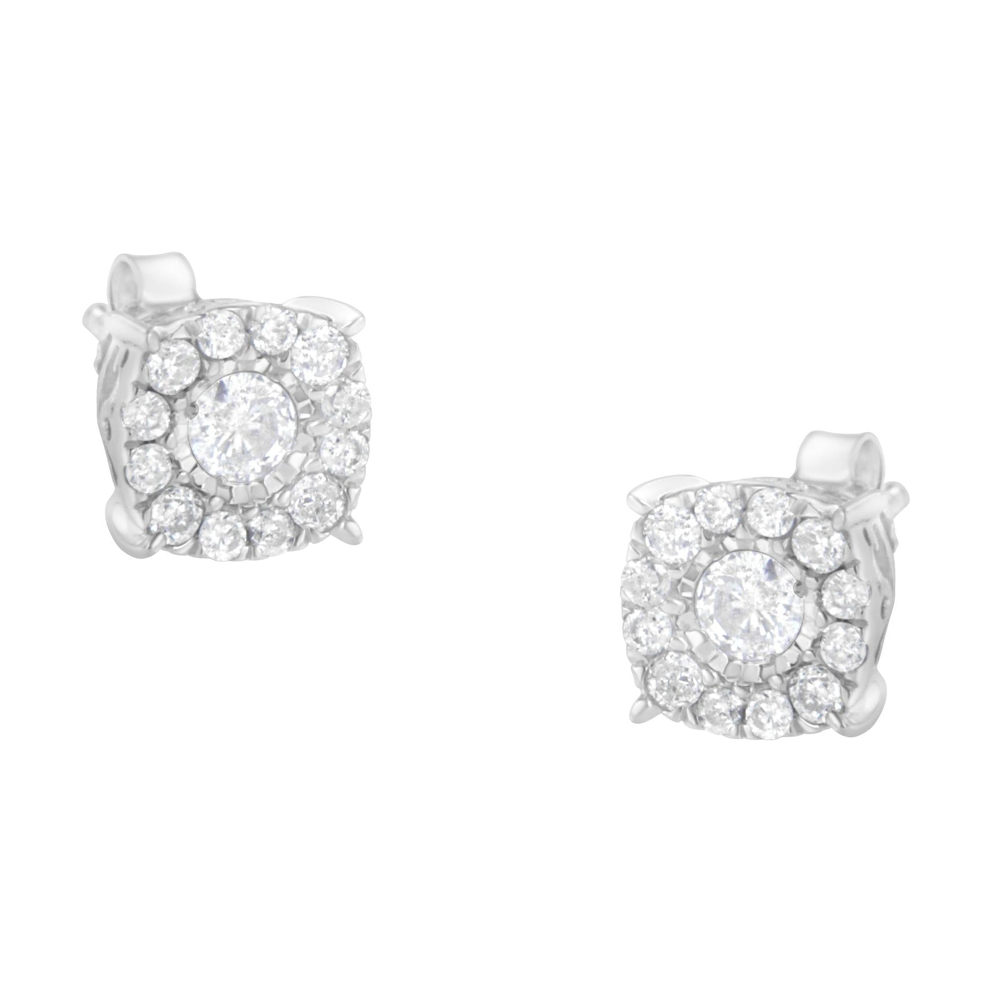 You will love these luxurious sterling silver stud earrings. A round cut diamond is surrounded by a twinkling halo of smaller round diamonds. The 1/2ct diamond design is mounted over a filigree decorated box. A push back mechanism keeps them securely in place.