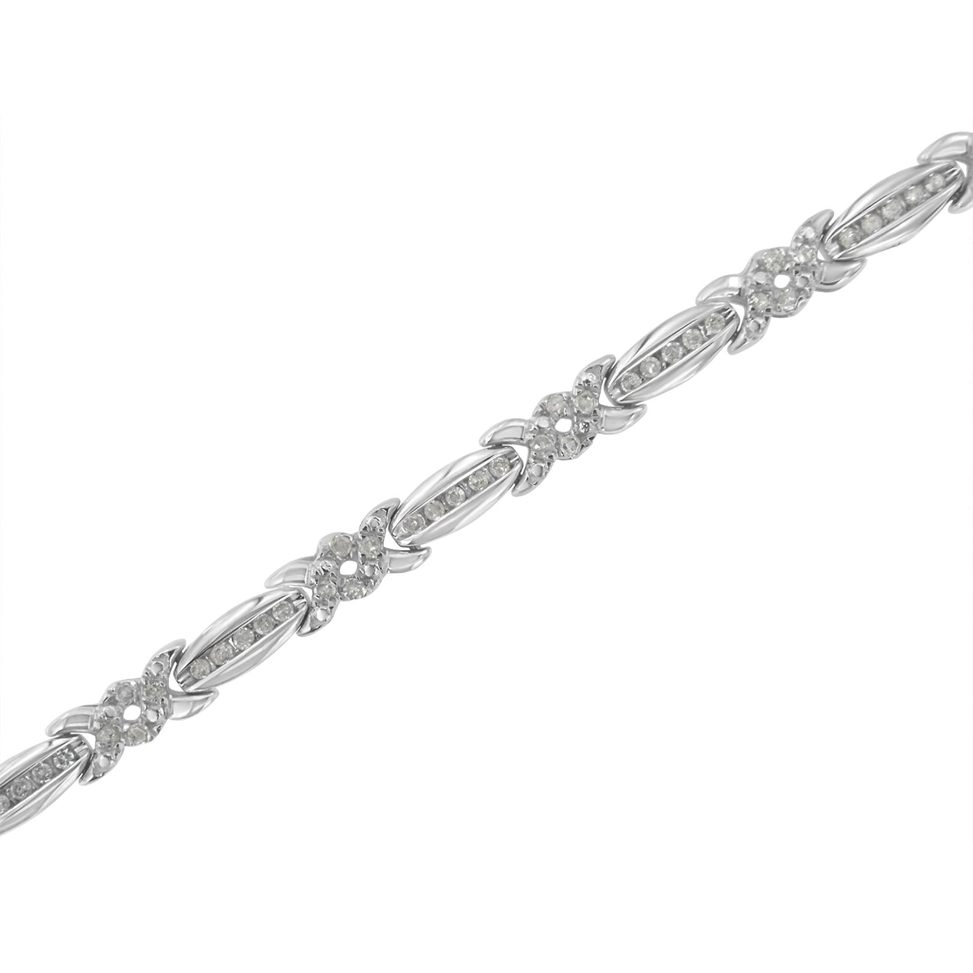 This delicate diamond link bracelet features alternating X and oval-form motifs set with diamonds throughout. There are 103 total diamonds, with a total weight of 1 carat. The diamonds are set in the finest .925 sterling silver.