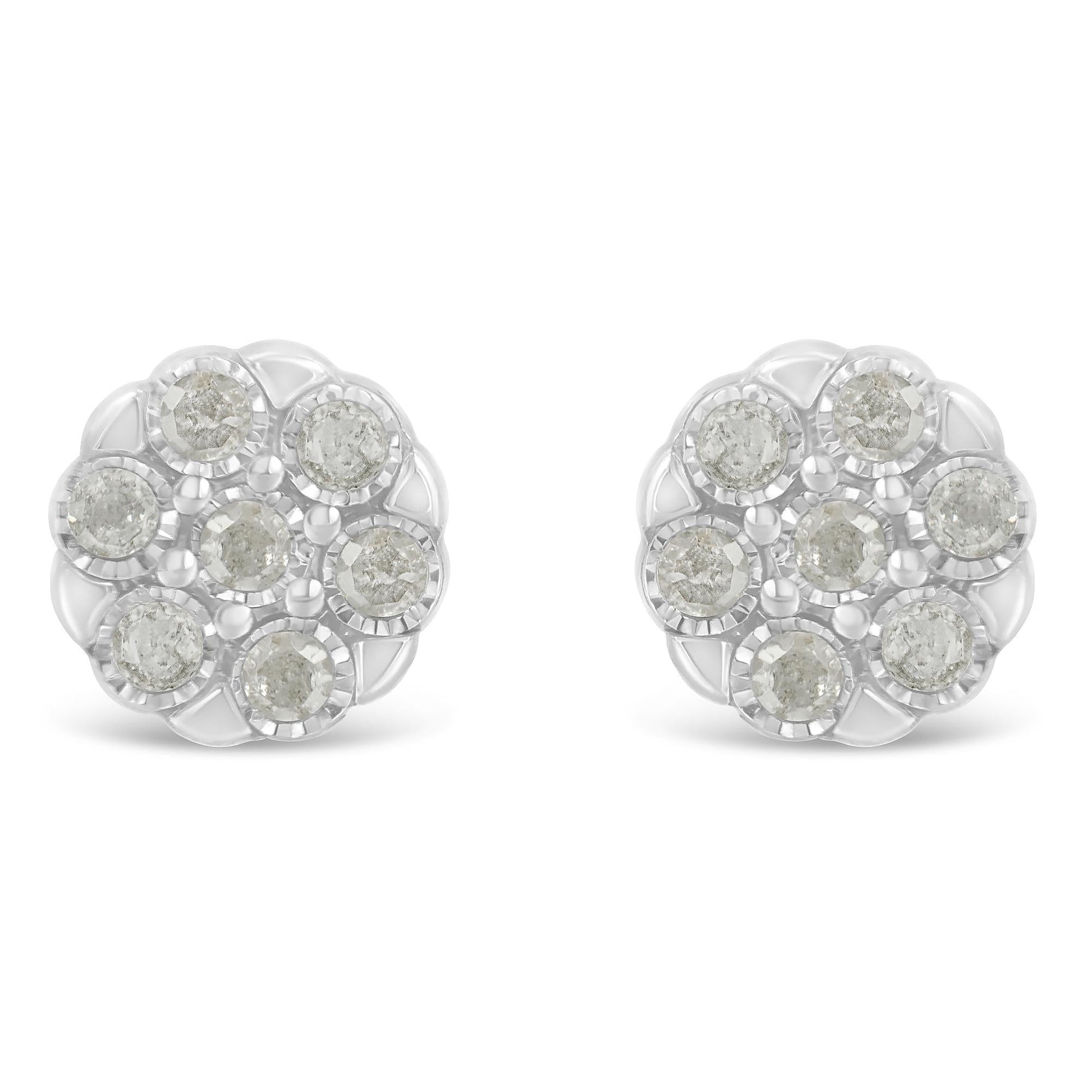 Indulge in the timeless elegance of these exquisite stud earrings, meticulously crafted from .925 sterling silver. Each piece is a delicate masterpiece, featuring a charming floral cluster design that blooms with nine natural, rose-cut diamonds. These gems, totaling 1/4 cttw, dazzle in shades of I-J color and bear the unique clarity of I2-I3, set in a close-knit pattern that captures and reflects light with every turn, offering a gentle, mesmerizing shimmer. The diamonds are thoughtfully enclosed in a finely crafted bezel, enhancing their natural sparkle against the subtly raised, layered silhouette. Designed for both comfort and security, the classic push-style backings provide peace of mind, allowing these treasures to adorn your ears effortlessly. Perfect for special occasions or adding a touch of sophistication to your everyday look, these earrings promise to be a cherished addition to any jewelry collection.