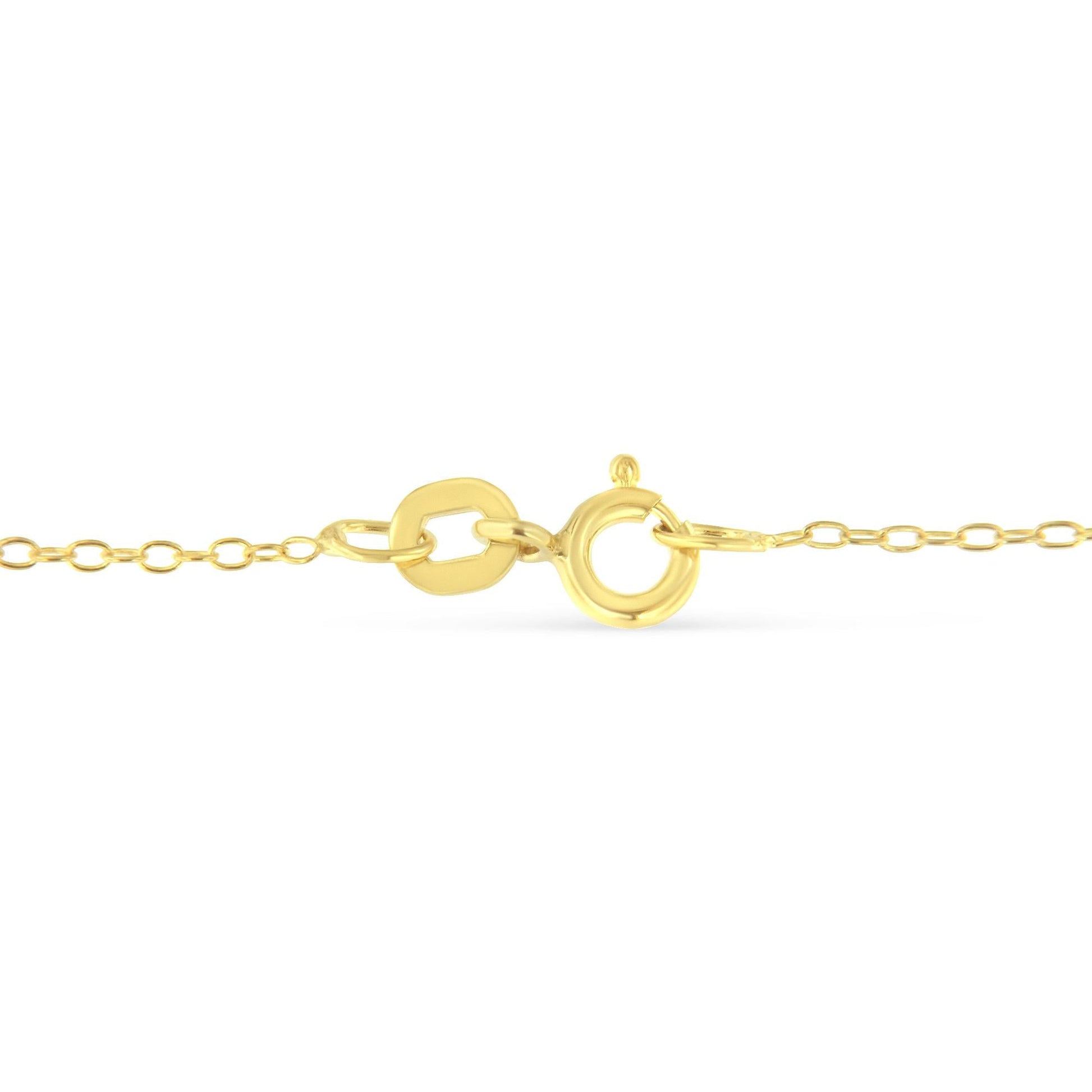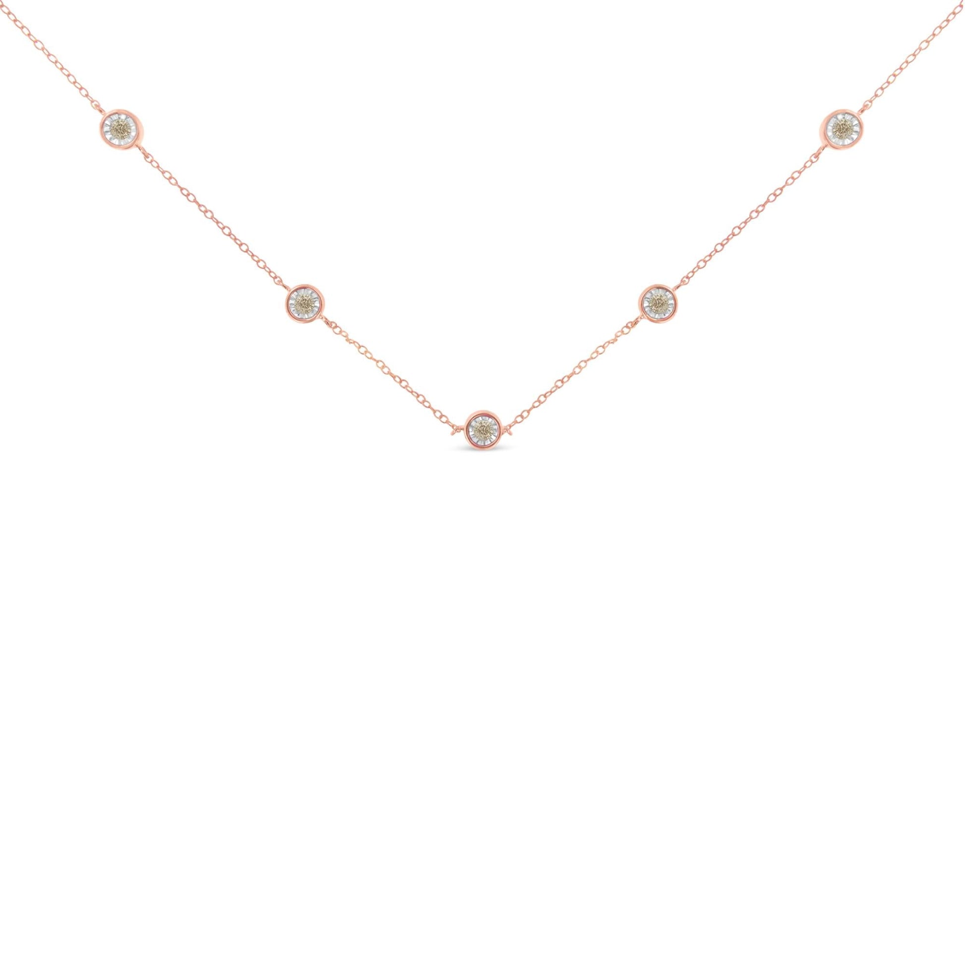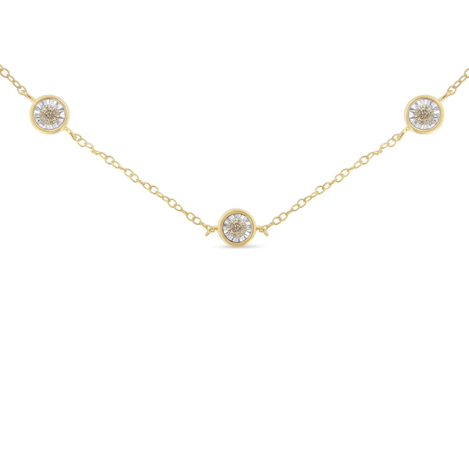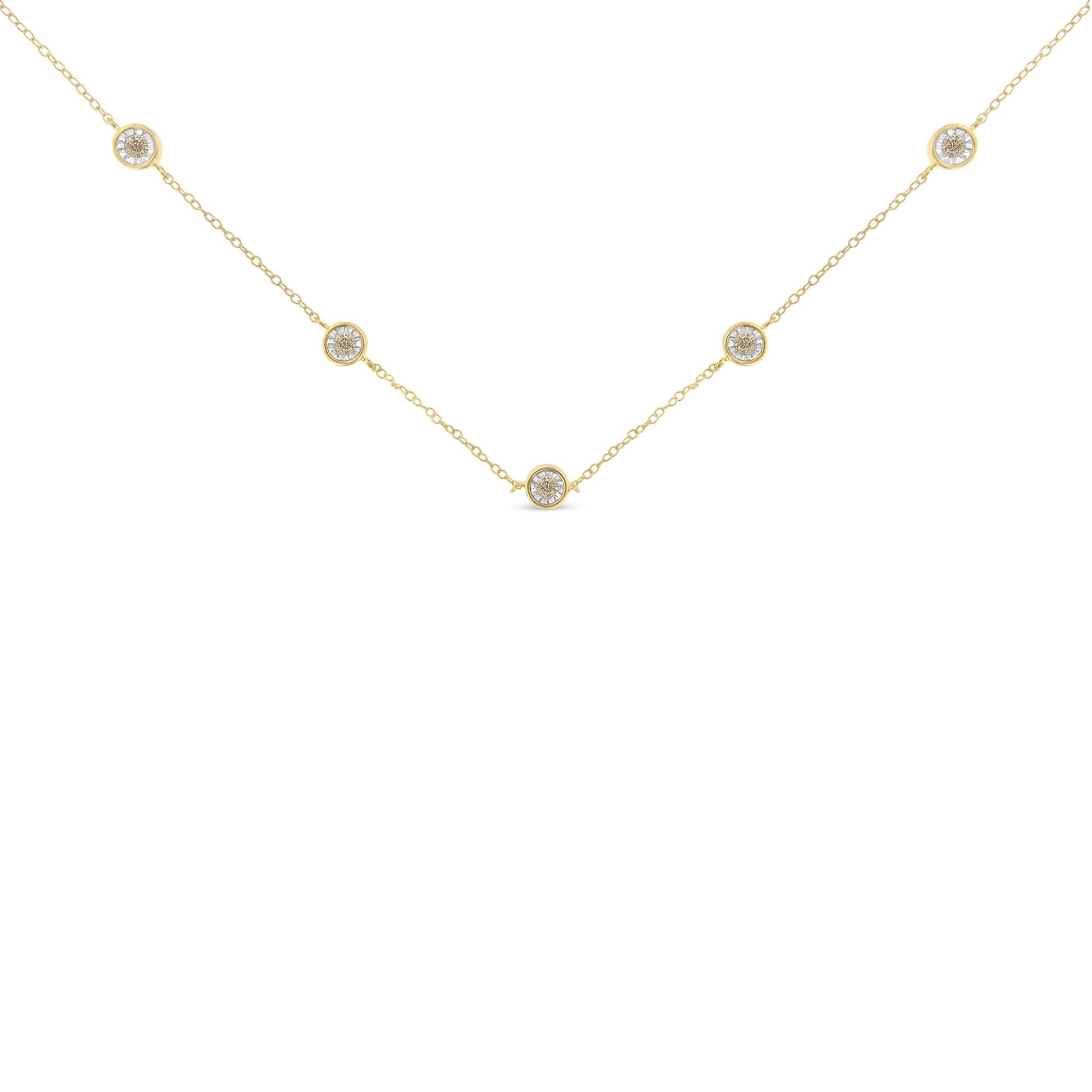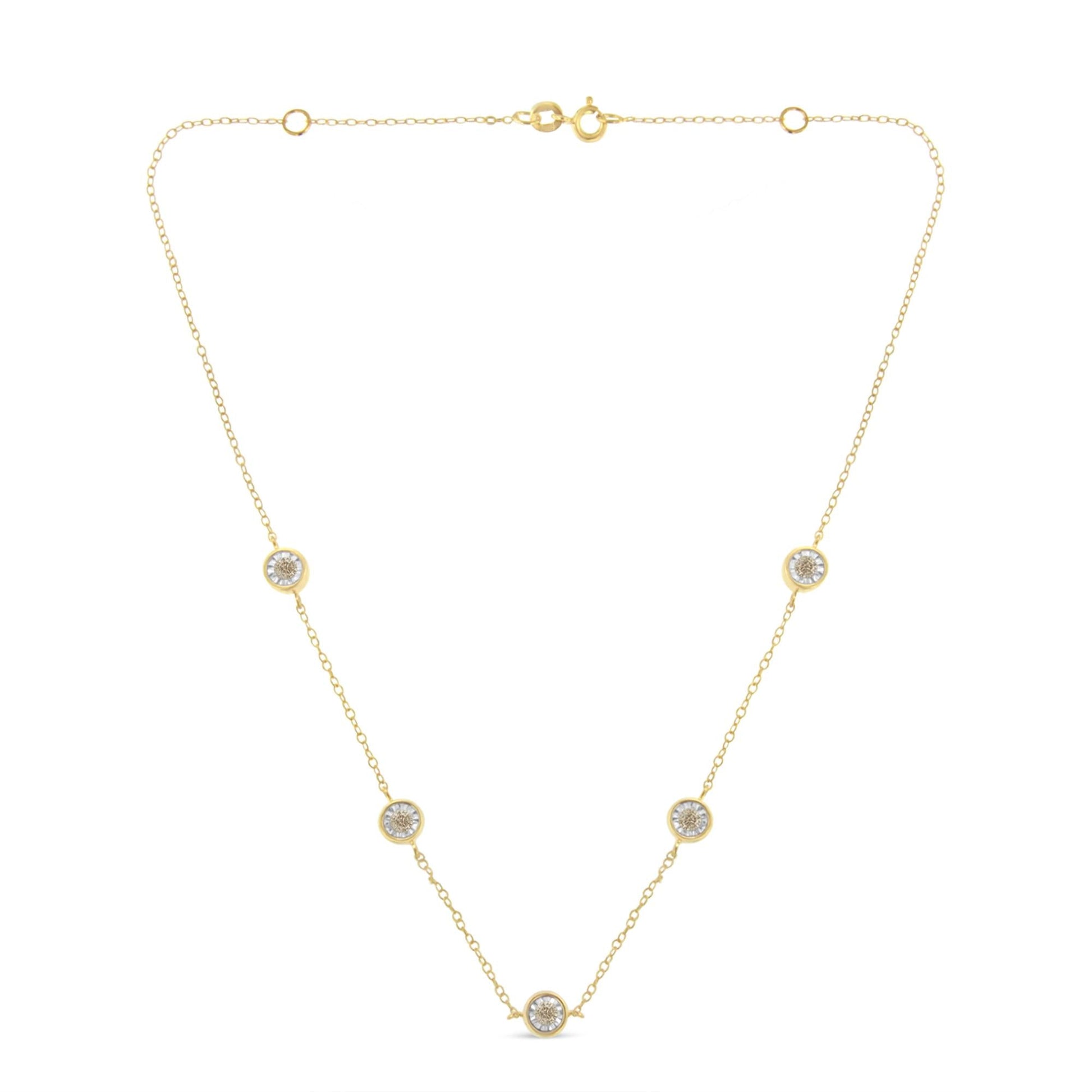 This station necklace features five diamonds miracle set along a sterling silver yellow and white colored chain. This delicate and intricate design has a total diamond weight of .5 carats.The necklace measures a 18 inches around.